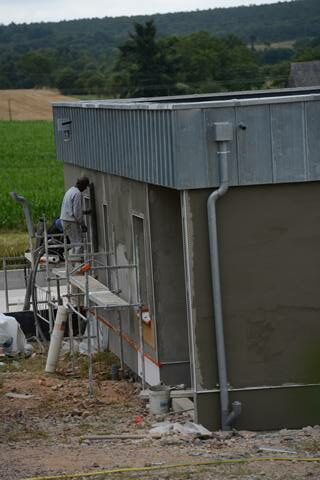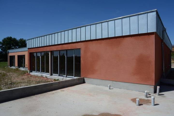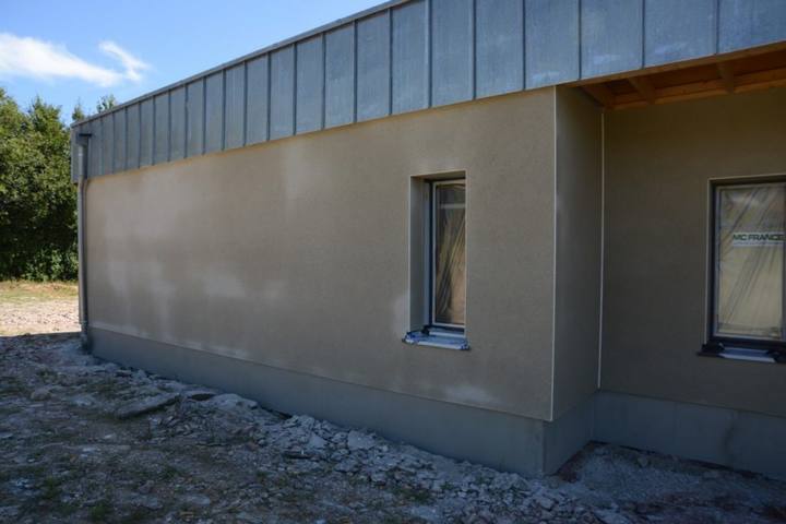 La façade de l'espace commun est habillée de panneaux de fibres de bois recouverts d’un bel enduit naturel "chaux-ciment", laissant respirer le bâtiment.