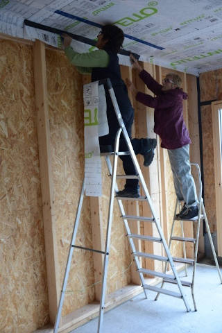 Roméo jeune maltais, et Lyam jeune américain, tous deux "workaway", se sont joints à l'équipe des bénévoles du centre d'études, pour la pose du pare-vapeur.